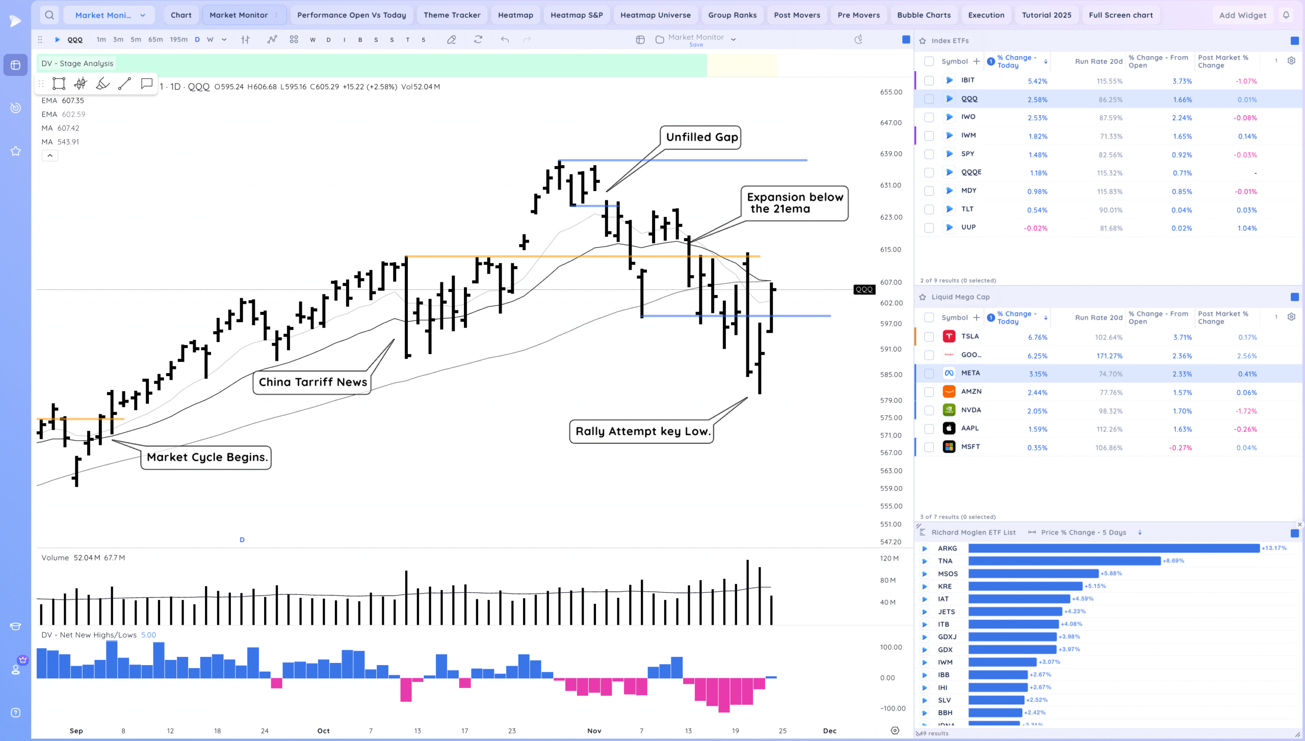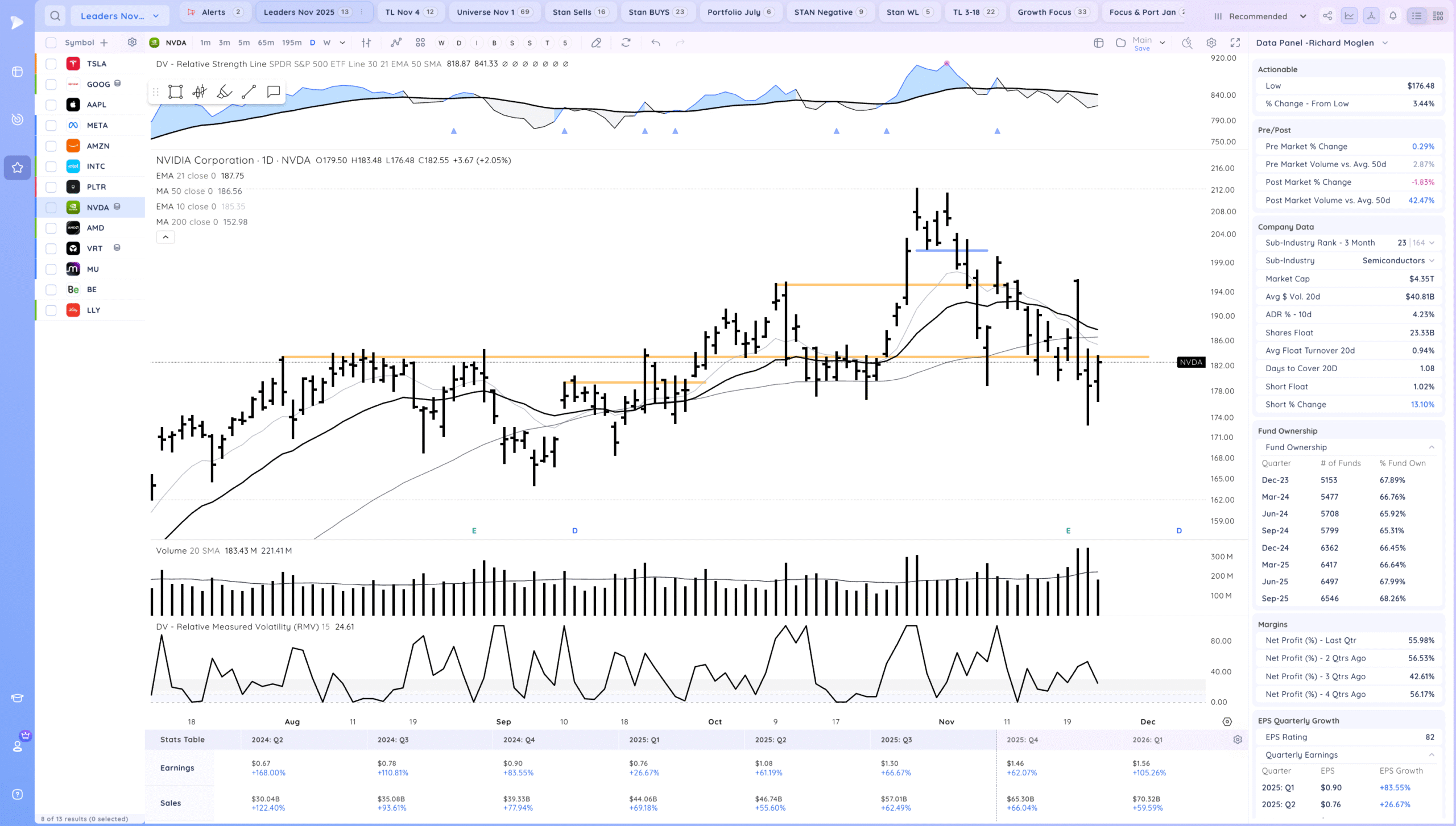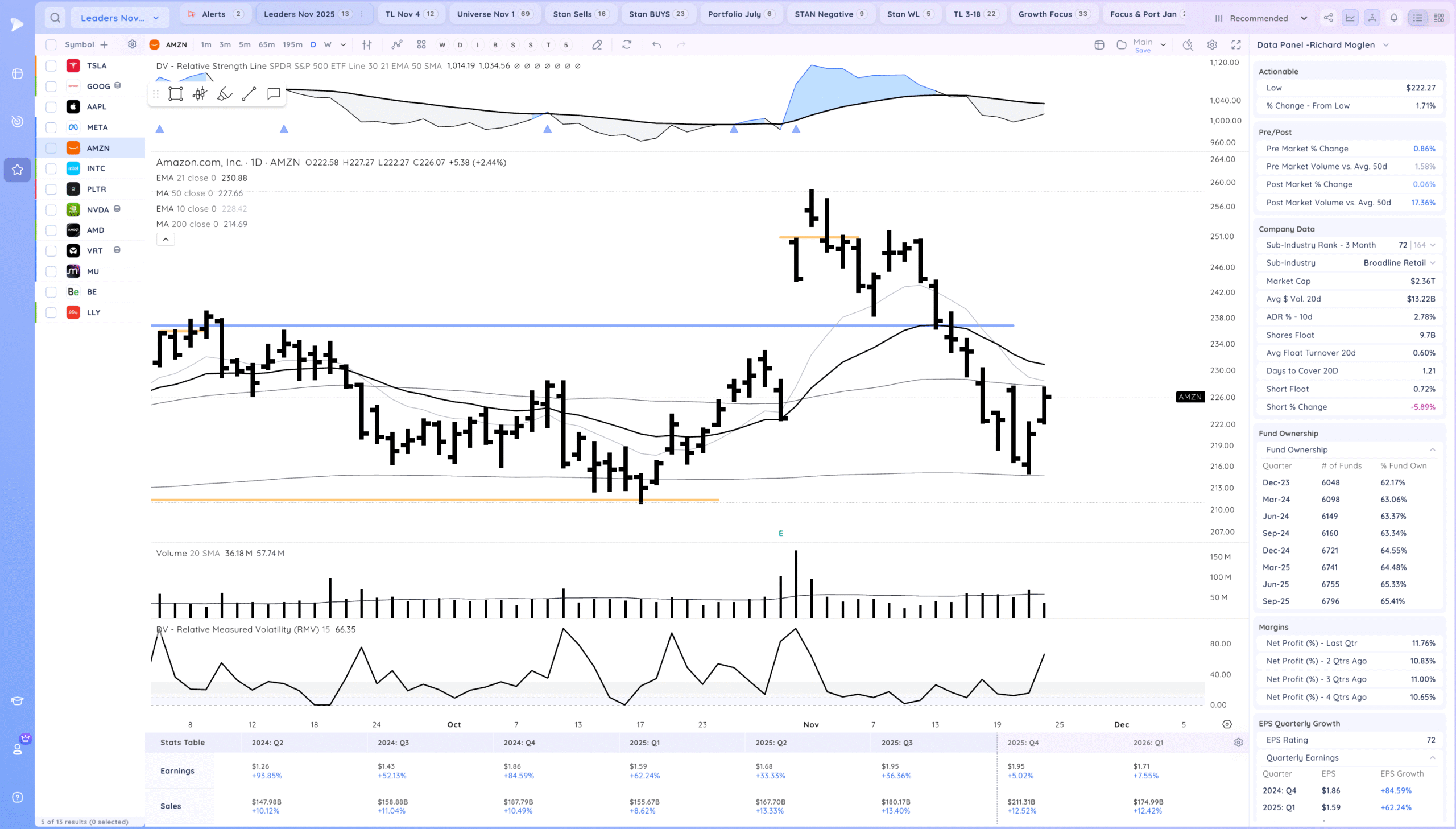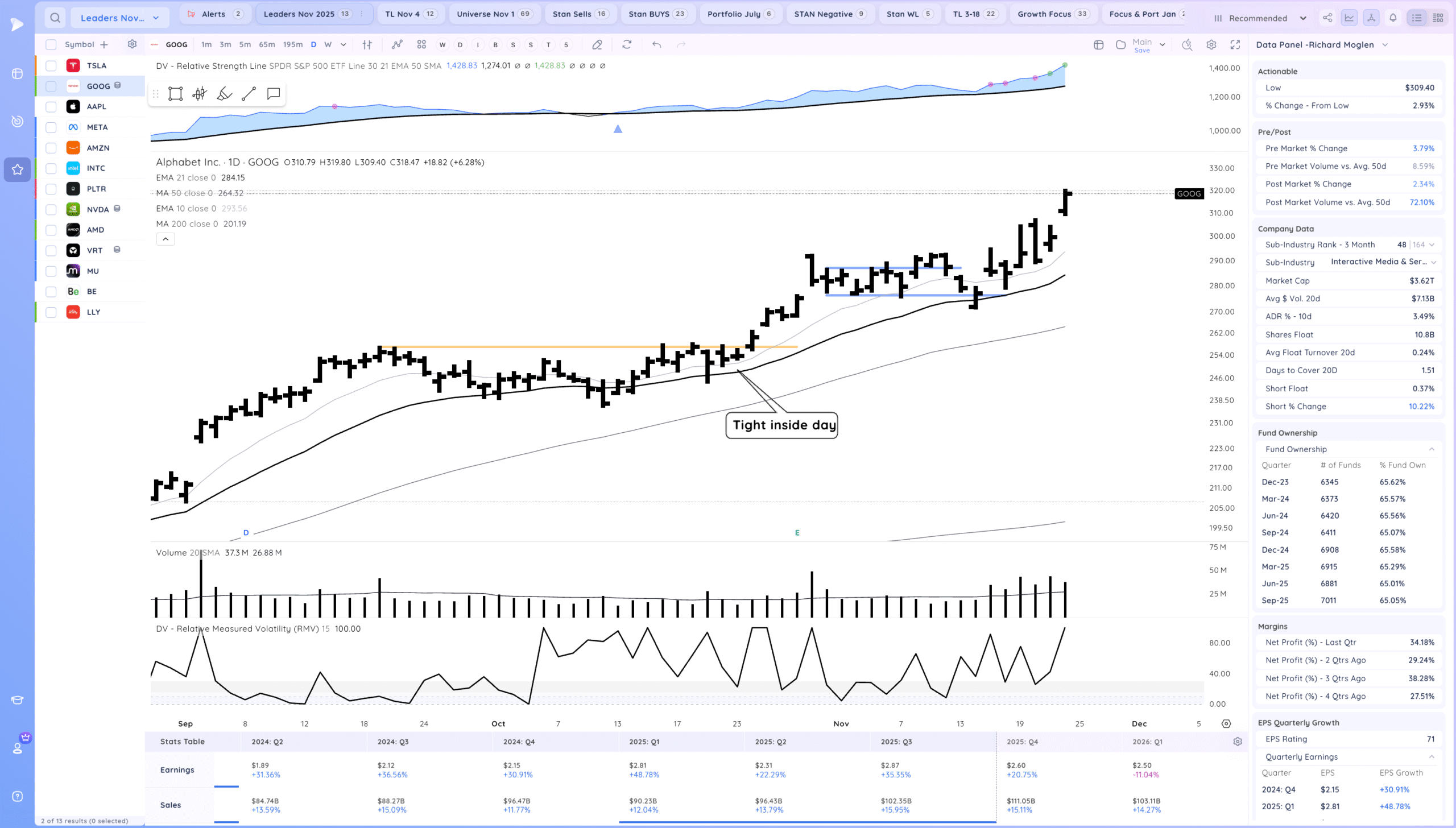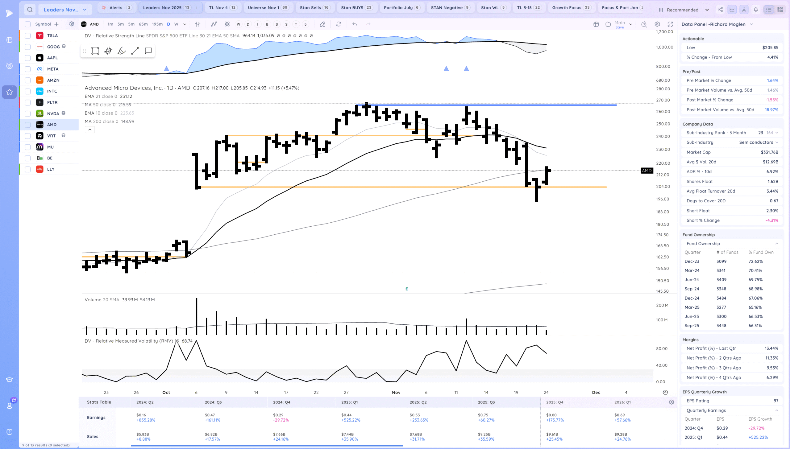 Follow through higher and now testing the MAs. Expecting some pause there. Semis waking up a bit. It will be great for growth names if the AI theme recovers. What would be constructive now is a higher low to be put in and for the market to tighten. Watch for RS on down days and stocks already forming their right sides of bases.