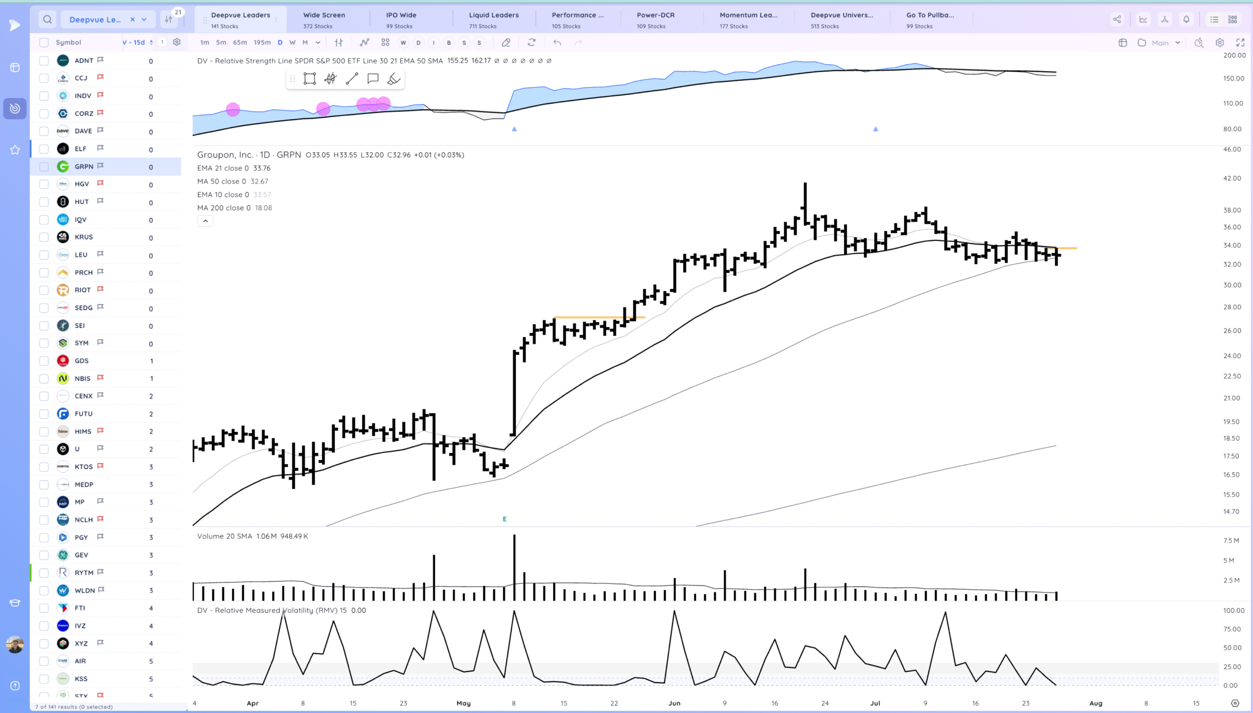 GRPN watching for a 21ema pop