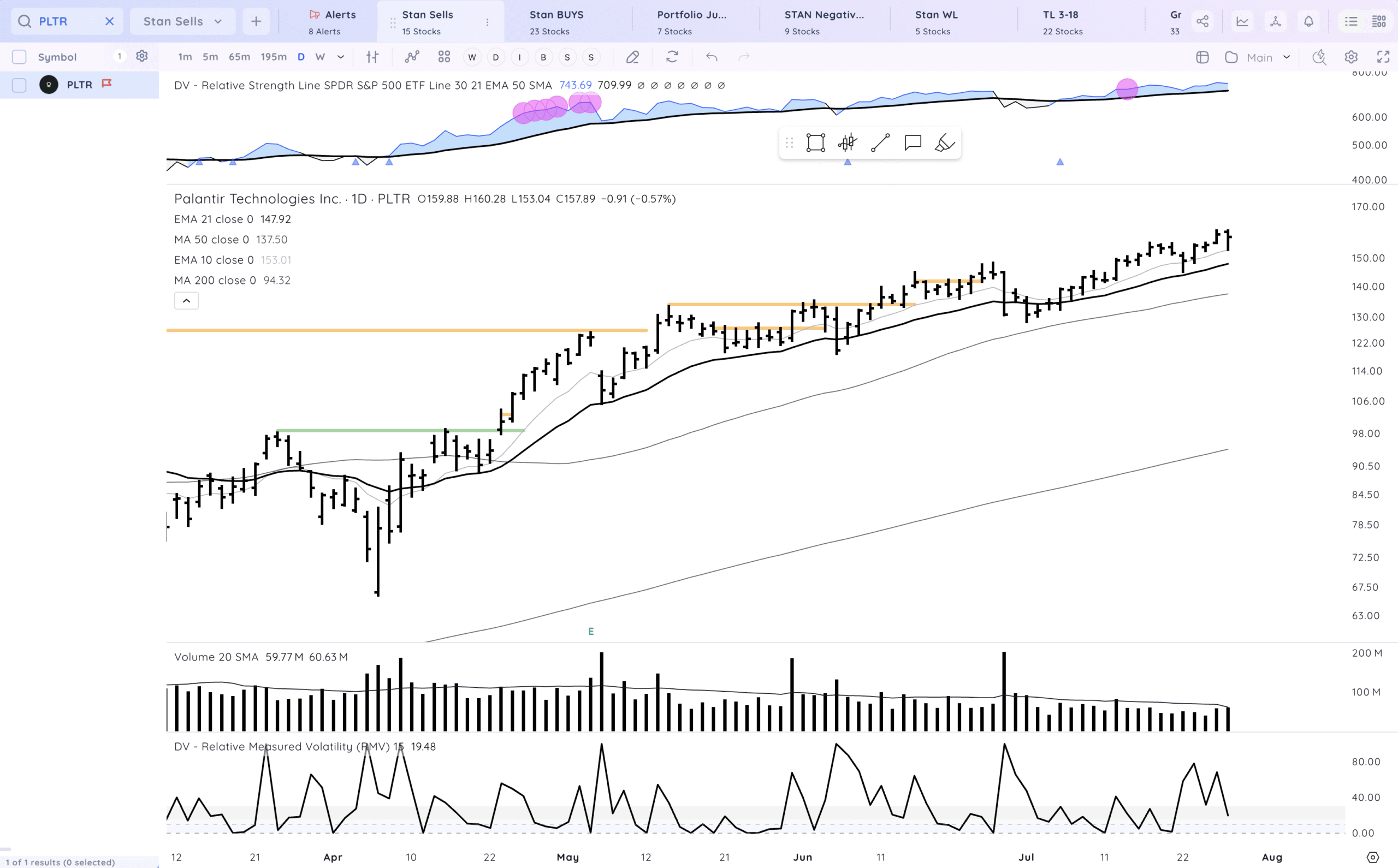 PLTR shake and strong close off the 10ema, trending. likely treads water until earnings