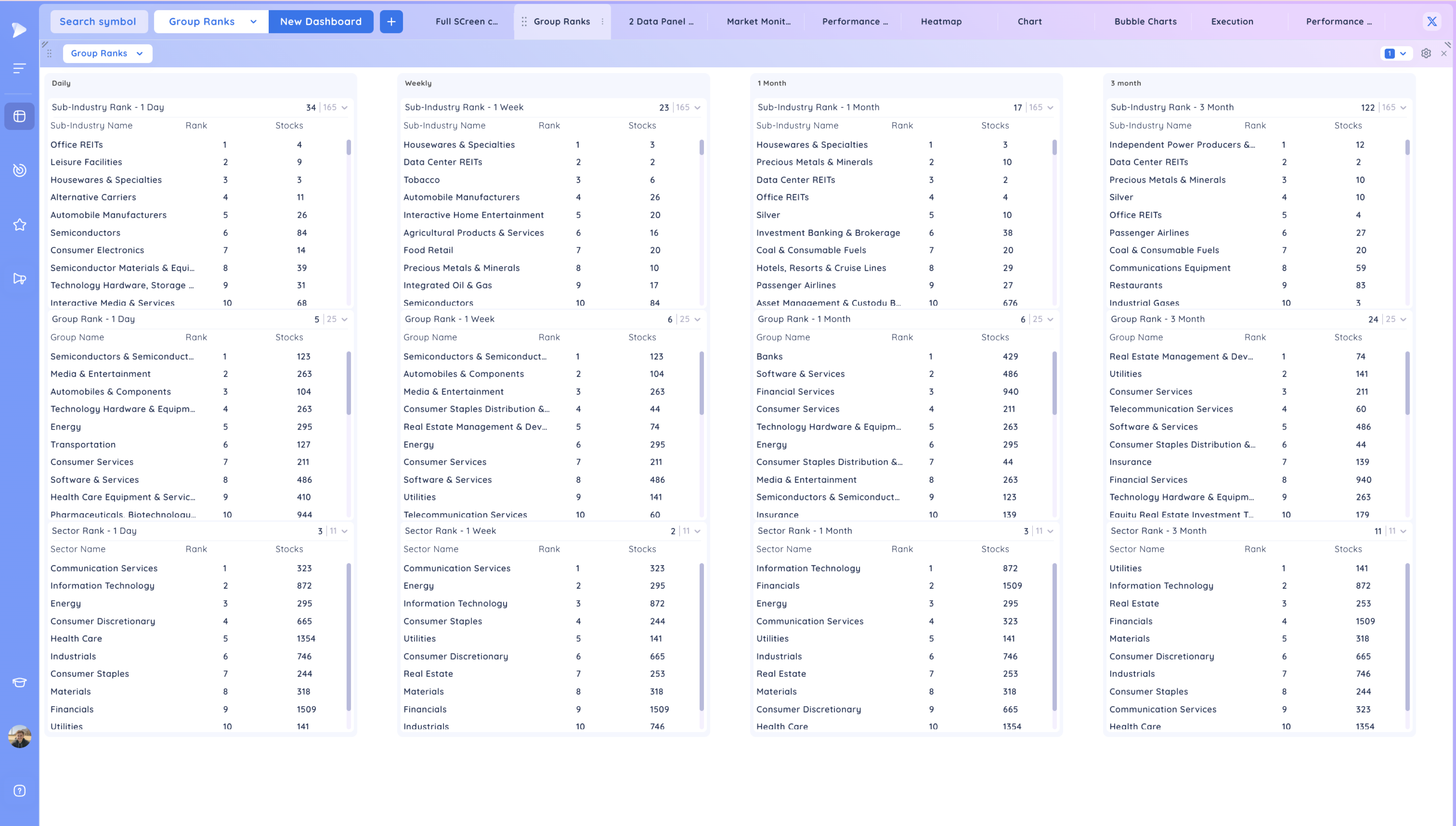 Group Ranks: 1 Day, 1 Week, 1 Month, 3 Month from left to right