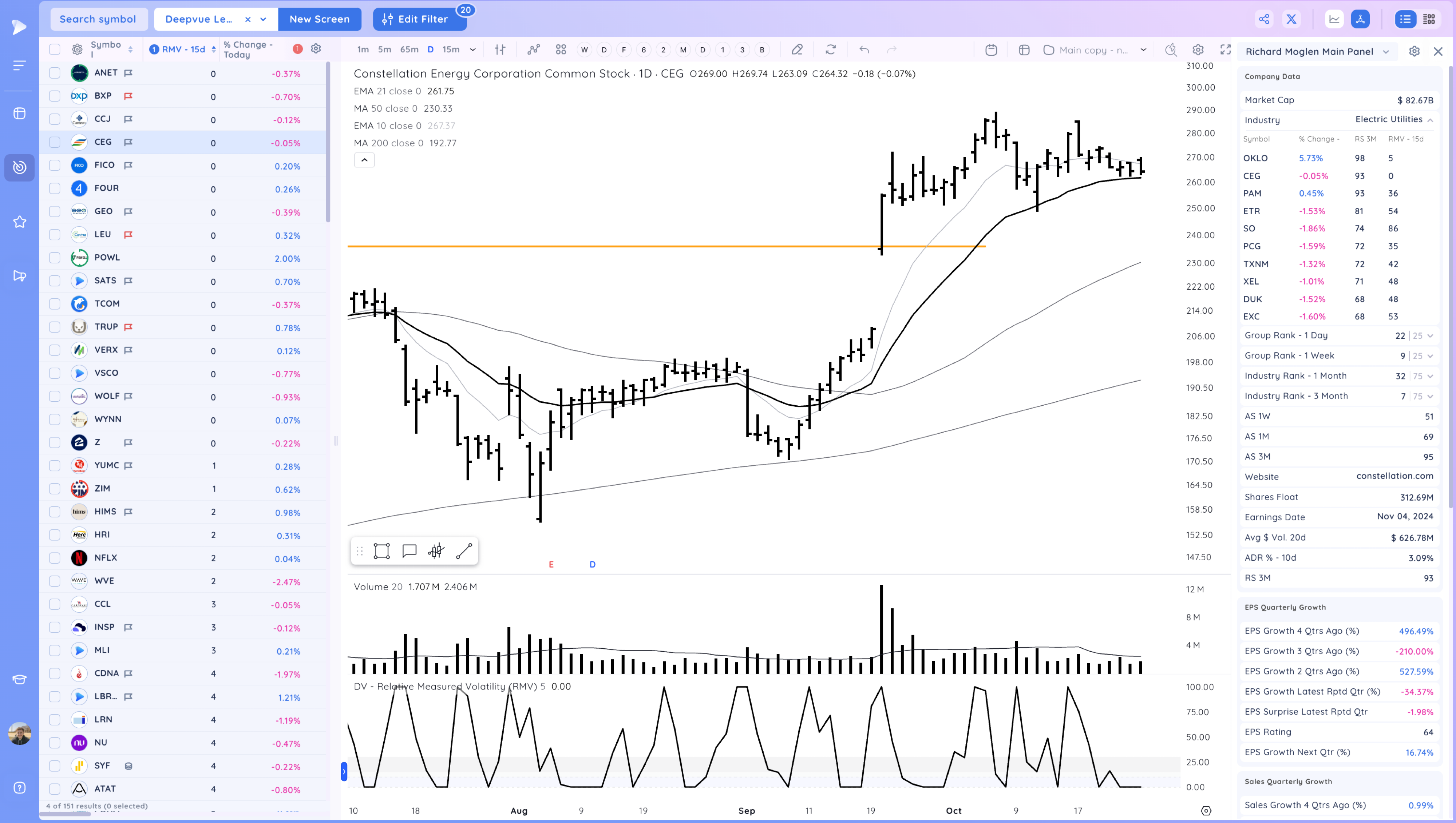 CEG tight at the 21ema in this base. Earnings Nov 7